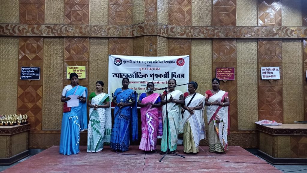 In Guwahati, the Grihokarmi Adhikar Suraksha Samiti (GASS) observed International Domestic Workers’ Day at Pragjyoti ITA Center, Machkhowa, Guwahati. Sr. Advocates and renowned social workers Santanu Borthakur, Krishna Gogoi, senior journalist Durba Ghosh, social worker and feminist rights activist Dr. Indranee Dutta presided over the function which saw participation of 200 domestic workers despite the continuous rains.