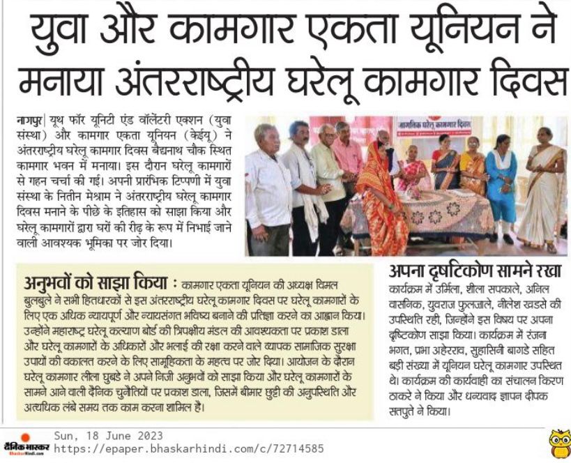 In Nagpur, YUVA and the workers’ collective, Kamgar Ekta Union, organised a public function on the occasion of International Domestic Workers’s Day The dignitaries shed light on various issues including domestic workers’ pension, bonus, insurance, scholarship for children’s education, health, paid holidays, worker’s status, health and social security through the establishment of a three-tier board. Also, 28 domestic workers were felicitated by the Union for having been selected under the Samman Dhan Yojana of the Maharashtra State Domestic Workers Welfare Board. Based on the resolution passed on the occasion, a representation was sent to the Chief Minister and Labour Minister through the District Collector and the Assistant Labour Commissioner.